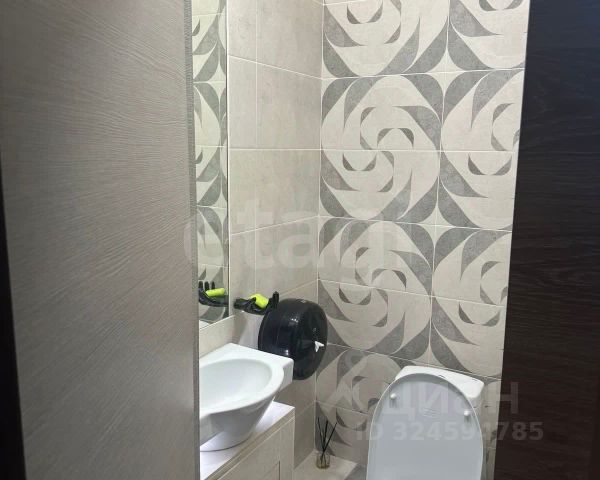 Санузел в керамической плитке, будут установлены подвесная раковина с тумбой, шкаф с зеркалом и подсветкой, глубокая и широкая акриловая ванная, подвесной безободковый унитаз, душевая стойка с тропическим душем, полотенцесушитель, предусмотрены выводы для слива воды стиральной машины и водонагревателя,