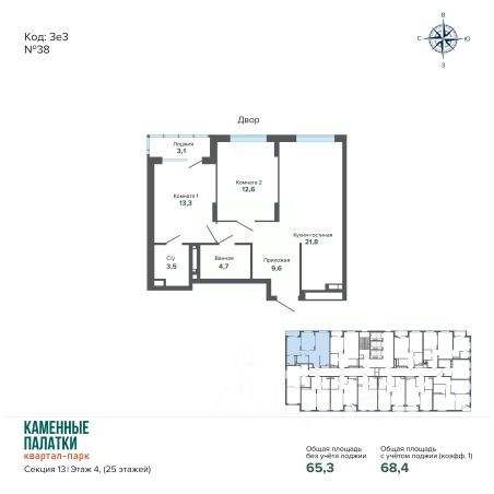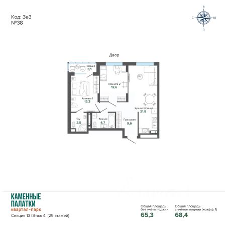 Квартира общей площадью 91,2 кв. м: большая светлая кухня-гостиная - 30,2 кв. м с выходом на лоджию, две спальни - 21 и 16,3 кв. м, прихожая и коридор - 17,2 кв. м, два санузла, кладовая.