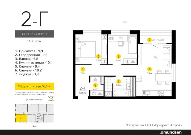 Жилой квартал "Amundsen" - для себя, для семьи, для жизни и развития. Авторская концепция проекта эффектно выделяется в 3 особенностях комплекса: фасады, двор и места общего пользования. AMUNDSEN ПРОЕКТ С ХАРАКТЕРОМ ВЕЛИКОГО ПЕРВООТКРЫВАТЕЛЯ. 4 СЕЗОНА: Двор-трансформер позволяет активно использовать все площадки круглый год. В холодное время года санки, коньки и снежные бои за главную башню. В теплое время источник наполняет двор водой и прохладой. Работают площадки для активных игр и спокойного отдыха. 6 ДЕТСКИХ ПЛОЩАДОК: Мы разделили площадки по возрастным группам для малышей и детей постарше. Качели, аттракционы, водные и активные игры созданы, чтобы познавать мир. 5 ПЛОЩАДОК ДЛЯ СПОКОЙНОГО ОТДЫХА: За счет игры с ландшафтом мы создали приватные зоны, украсили пространство разнотравьем, оживили двор источником. Шум воды, лежаки, беседки, парк места, где ты почувствуешь течение жизни. AMUNDSEN ИДЕАЛЬНОЕ МЕСТО ДЛЯ ЖИЗНИ И РАЗВИТИЯ. - Жилой квартал расположен в экологически чистом районе в окружении двух лесных массивов. - Новые современные школы и детские сады. Спортивный кластер для занятий. - Главный холл пространство для всех. Для самых маленьких игры, для взрослых кафе с ярким дизайном, тихий коворкинг, места для отдыха и светлый, просторный атриум. - Детские площадки "будущего" с оригинальным подходом к созданию игровой среды. - Безопасная территория. Круглосуточная охрана, видеонаблюдение 24/7, электронная система доступа, двор без машин. Застройщик ООО СЗ "Прогресс-Строй", проектная декларация на сайте наш.дом.рф