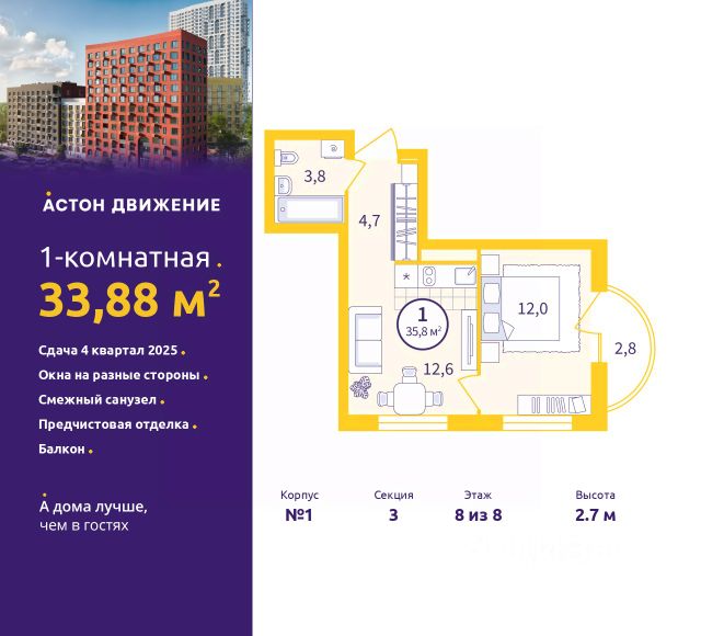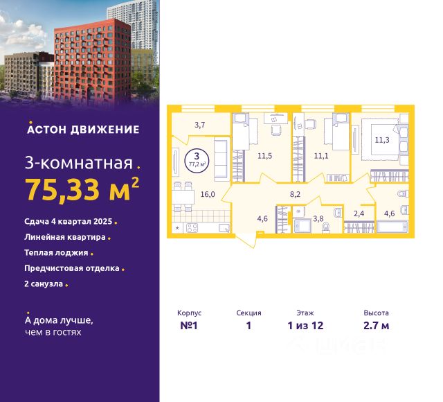 Торопитесь забронировать на этих условиях! Период предложения ограничен! Стоимость квартиры указана со скидкой, ваша экономия составит 2,760,000 RUB. Информация по телефону, наши менеджеры вам все расскажут! Продается 3-комн. квартира от застройщика с предчистовой отделкой в ЖК "Астон.Движение" на 1 этаже. Общая площадь: 75.33 кв.м., жилая: 33.9 кв.м., площадь просторной кухни-столовой: 16 кв.м. Комнаты изолированные, все окна выходят на одну сторону. В квартире одна лоджия, два совмещенных санузла. Высота потолков 2.7 м. Отделка white box - золотая середина между чистовой и черновой отделкой. В вашей квартире будут выполнены работы: стяжка пола; выровнены и оштукатурены стены; затерты швы на потолке; электроразводка во всех помещениях; полностью готовая система отопления, водопровод и канализация; установлена входная металлическая сейф-дверь. Дом монолитный, трехподъездный, переменной этажности, от 8 до 12 этажей. Квартира находится в 1-й секции высотой 12 этажей в корпусе 1. На этаже 10 квартир. В подъезде 2 грузовых лифта. Окончание строительства - 4 квартал 2025 года. Оформление сделки по договору долевого участия. Квартал Астон.Движение расположен в развивающейся части Новой Сортировки, на пересечении улицы Пехотинцев и переулка Проходной. Первая очередь 6 домов разной этажности, детский сад и бульвар с прогулочными аллеями в окружении зелени. В архитектуре отдано предпочтение отдельно стоящим секциям, благодаря чему получилась большая вариативность планировок, много видовых квартир с окнами на разные стороны, а постепенный набор высоты домов позволит наполнить солнечным светом каждую квартиру. Первые этажи домов соединяет большая галерея товаров и услуг для жителей и гостей квартала. Двор обустроен для приятного и неспешного движения. Полностью закрытый, без доступа автомобилей, с плавными линиями прогулочных тропинок. Игровые площадки для малышей и ребят постарше находятся на отдалении друг от друга. А взрослым можно разместиться в уютных беседках, на скамейках со столиками в тени деревьев или заняться спортом в уличном воркауте. В холлы организован безопасный безбарьерный доступ: нет риска получить травму или оступиться. Просторные лобби с современной дизайнерской отделкой, ресепшен, кофе-пойнтами и мягкими зонами наполнены светом и воздухом. Чистовая отделка включает: • В комнатах, коридоре и кухне — ламинат 32 класса на звукоизоляционной подложке. В ванной — напольная керамическая плитка; • Стены покрыты обоями и окрашены. В ванной влагостойкая краска нейтрального цвета; • Потолки зашпаклёваны и окрашены; • Установлены глухие межкомнатные двери одной модели; • Сантехника — раковина, унитаз и ванна. #Zwd33f