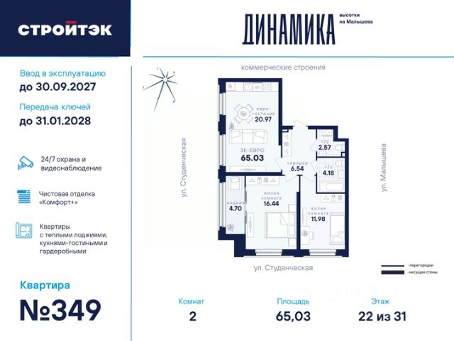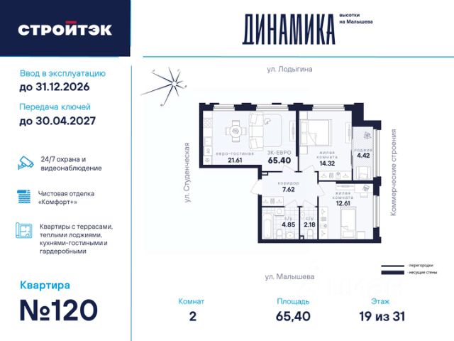 Настройте жизнь на максимум В Динамике воплощают мечты. Её фасады стремятся ввысь и рисуют силуэт ступеней — символа вашего движения, где всё задуманное сбывается. В интеллигентном микрорайоне Втузгородок всё под рукой. Пешком до остановки 5 минут, на машине до центра — 10. Соседство с торговыми комплексами и доступность ЕКАД входят в число преимуществ квартала наравне с близостью УРФУ, главных театров, филармонии, школ и детсадов. Выгляните в окно — и увидите знаменитое озеро Шарташ, которому около миллиона лет. Здесь катаются на сапах, лодках и катамаранах, а в Шарташском лесопарке вокруг озера — на велосипедах летом и лыжах зимой. Новое звучание района Выразительные башни Динамики притягивают взгляды издалека. Сплошные стеклянные витражи фасадов меняют восприятие проекта в зависимости от ракурса, времени года и суток. В квартирах с витражным остеклением алюминиевые оконные рамы и широкие подоконники визуально увеличивают пространство. Благодаря современным технологиям витражи обеспечивают дополнительную теплоизоляцию, помогая сохранять комфортный микроклимат в квартире и летом, и зимой. Отдых в вашем ритме Выбирайте досуг по душе для себя и семьи. Занимайтесь на тренажёрах и воркаут-комплексе, играйте в пинг-понг, футбол или баскетбол. А детей предоставьте насыщенному плейхабу, который тренирует тактильность и равновесие в атмосфере безопасности и контролируемого риска. Размеренно прогуливайтесь меж декоративных холмов, под тенистыми навесами-перголами вблизи удобных скамеек, многолетних трав и разновысотной уличной мебели. СТРОЙТЭК возводит Динамику в 3 этапа. Второй этап строительства В нём 2 секции. С2 — престижная высотка в 31 этаж. Здесь 209 квартир от 1- до 3-комнатных и 19 уникальных планировок с просторными кухнями-гостиными до 21 м квадратного. Кроме того, закрытый паркинг на 31 место и 40 кладовых-келлеров внутри стилобата. В подъезде С2 — светлый холл с минималистичным дизайном бизнес-класса, помещения для колясок и самокатов, а также 3 надёжных лифта на 1 000 кг каждый. С4 — парадный 6-этажный дом с элегантной смещённой геометрией и полным витражным остеклением всех 5 жилых этажей. Внизу расположено впечатляющее лобби с лаунж-зоной и стойкой ресепшен, атмосферная уличная площадь для встреч и торговая галерея. В секции всего 34 квартиры в 16 уникальных планировках от студий до 3-комнатных. Это особый уровень респектабельной и неторопливой жизни. Технологии комфорта Обратите внимание на специальные форматы планировок с гардеробными и тёплыми лоджиями. Отдельно в С4 — на видовые квартиры с террасами на 5 и 6 этажах, а также лоты с мастер-спальнями, где у приватного пространства для отдыха своя ванная. Что касается отделки — в Динамике улучшенный стандарт "Комфорт+". Помимо привычных комфортных сантехники и электрики, в него входят оконные стёкла Energy Light, приточные клапаны вентиляции Air-Box, особо прочный ламинат 33 класса и устойчивые к многократной покраске виниловые обои. Белые межкомнатные двери и плинтусы лаконично подчеркну