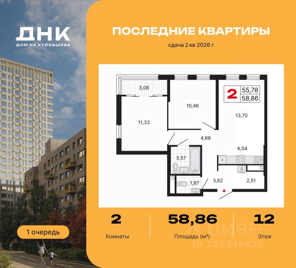 Продается двухкомнатная квартира с предчистовой отделкой в ЖК "ДНК. Дом на Куйбышева" на 15 этаже. Общая площадь: 58.16 кв.м., жилая: 20.69 кв.м., площадь просторной кухни-столовой: 15.07 кв.м. Комнаты изолированные, все окна выходят на одну сторону. В квартире одна лоджия, два совмещенных санузла. Высота потолков 2.7 м. Квартира находится в корпусе 1. Дом монолитный, одноподъездный, высотой 25 этажей. На этаже 9 квартир. В подъезде 2 пассажирских и 1 грузовой лифт. Окончание строительства - 2 квартал 2026 года. Оформление сделки по договору долевого участия. "Дом на Куйбышева" - это современный городской дом в 10 минутах от центра Екатеринбурга со своим зеленым двором-оазисом. Проект расположен в точке, где одинаково удобно жить в разных сценариях: рядом парк Маяковского, Шарташский рынок, ключевые ВУЗы, школы, а муниципальный детский сад находится в соседнем доме. "Дом на Куйбышева - часть формирующегося квартала, где с каждым днем развивается инфраструктура и усиливается ощущение полноценной городской среды. Здесь одинаково комфортно выстраивать жизнь и семьям с детьми и тем, кто ценит свободу и личное пространство. #z7OFaZ