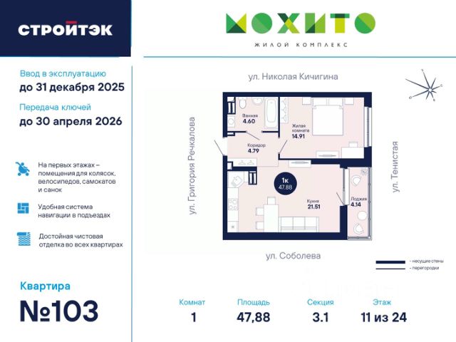 ЖК "Мохито" — это квартал комфорт-класса, уютно расположенный в границах улиц Тенистая Григория Речкалова Николая Кичигина. Первая очередь ЖК "Мохито" уже заселена, а вторая сдана в эксплуатацию в декабре 2025 года. Вторая очередь строительства дополняет и завершает облик ЖК. Дом состоит из двух секций в 24 этажа, которые объединяет между собой 8-этажный модуль. На первом этаже предусмотрены помещения для офисов. Академический район — один из самых молодых районов города Екатеринбурга. Прогрессивный подход к застройке, широкие улицы, транспортная доступность и богатая инфраструктура привлекает сюда новосёлов. Поблизости расположены 6 детских садов и 6 общеобразовательных школ. 4 спортивных клуба и 6 медицинских учреждений. "Магнит" в 5 минутах пешком. Торгово-развлекательный центр "Академический" всего в 5 минутах езды. Кольцевая автодорога в 10 минутах езды, а центр города — в 15 минутах. Во дворе для взрослых и детей - безопасные игровые площадки, футбольное и стритбольное поля, пикник-зона и шезлонги. Ухоженные дорожки среди деревьев и цветущих кустарников, скамейки и сад камней для прогулок. Подземная парковка на 87 автомобилей. Закрытый двор без посторонних и машин. Освещение внутренней территории. Круглосуточное видеонаблюдение. Комфортабельные подъезды Просторные холлы в "Мохито" — пример современного подхода к организации общего пространства в многоквартирном доме. Сдержанные тона в отделке, аккуратные почтовые ящики, коллажи на стенах и информативная навигация — всё сделано для удобства жильцов. Безбарьерная среда. Застеклённые тамбуры. Вместительный лифт облегчит доставку груза до 1 тонны. Для колясок и инвентаря в подъездах предусмотрено отдельное помещение. В каждом подъезде понятная навигация — заметные надписи с указанием этажей и номеров квартир облегчат курьерам или гостям путь в ваш дом. В ЖК "Мохито" предусмотрена стильная чистовая отделка: Пластиковые окна с двухкамерными стеклопакетами гарантируют теплосбережение зимой, а приточные клапаны вентиляции — поступление свежего воздуха летом. Установлены надёжная входная и стильные межкомнатные двери. На полу в прихожих, комнатах и кухнях уложен ламинат, а в уборных — керамическая плитка. Стены в санузлах окрашены, а также установлены раковины, смесители и унитазы. Стены комнат, кухонь и коридоров обклеены виниловыми обоями на флизелиновой основе. Розетки и выключатели расположены так, что ими удобно пользоваться. Радиаторы отопления с горизонтальной разводкой и терморегуляторами позволят установить комфортную температуру. На воду, электричество и тепло установлены телеметрические счётчики, а данные с них передаются автоматически.