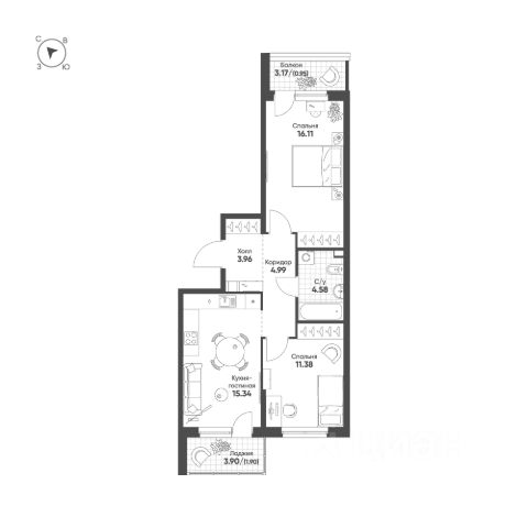 Комната 2 + гардеробная + свой санузел 18,1 м².