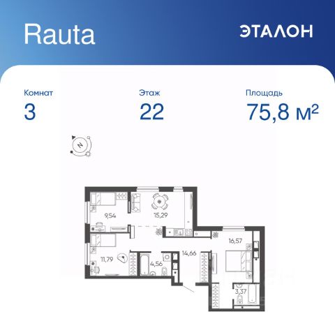 Продается 3-к квартира отделка White Box в ЖК "Rauta". Общая площадь квартиры — 75.78 кв. м, этаж 22 из 24. Тип дома — монолитный. Цена указана при 100% оплате.