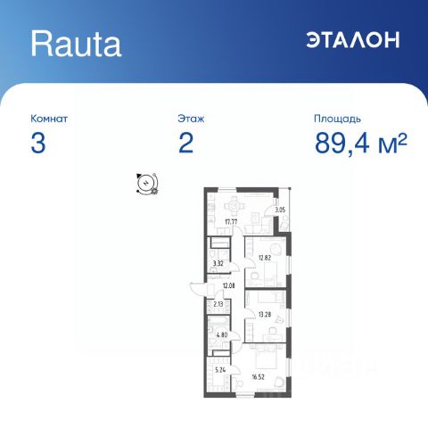 Продается 3-к квартира отделка White Box в ЖК "Rauta". Общая площадь квартиры — 89.4 кв. м, этаж 2 из 25. Тип дома — монолитный. Цена указана при 100% оплате.