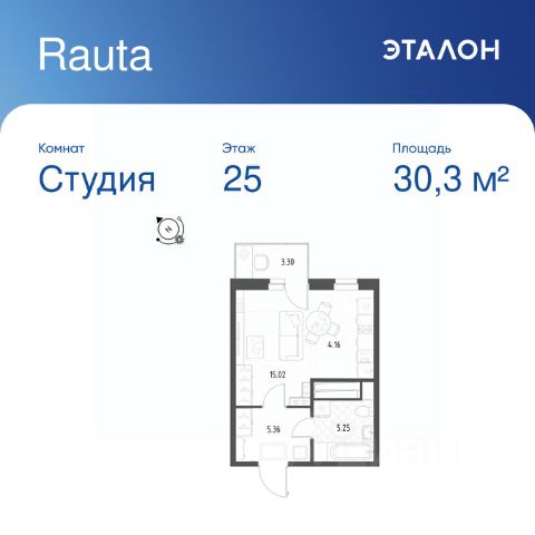 Продается студия отделка White Box в ЖК "Rauta". Общая площадь квартиры — 30.3 кв. м, этаж 25 из 25. Тип дома — монолитный. Цена указана при 100% оплате.