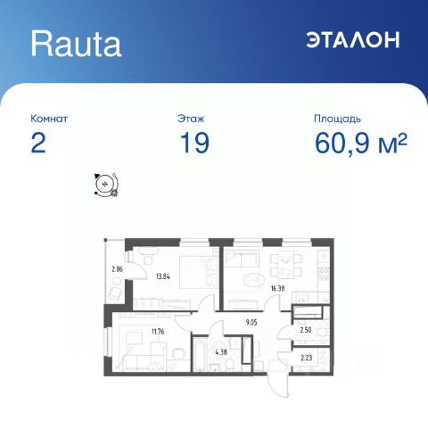 Продается 2-к квартира отделка White Box в ЖК "Rauta". Общая площадь квартиры — 60.9 кв. м, этаж 19 из 25. Тип дома — монолитный. Цена указана при 100% оплате.