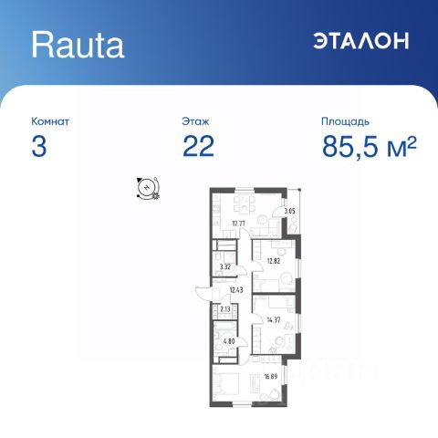 Продается 3-к квартира отделка White Box в ЖК "Rauta". Общая площадь квартиры — 85.5 кв. м, этаж 22 из 25. Тип дома — монолитный. Цена указана при 100% оплате.