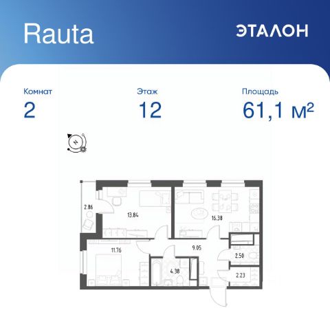 Продается 2-к квартира отделка White Box в ЖК "Rauta". Общая площадь квартиры — 61.1 кв. м, этаж 12 из 25. Тип дома — монолитный. Цена указана при 100% оплате.