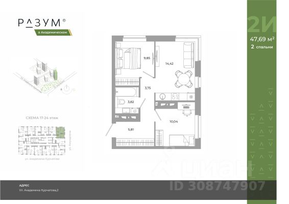 "РАЗУМ в Академическом" — это жилой комплекс из 7 домов переменной этажности от федерального девелопера "РАЗУМ" с 12-летним опытом создания жилых проектов. Дома от 12 до 24 этажей расположены в границах ул. Амундсена. В пешей доступности: - 6 школ; - 10 детских садов; - магазины; - поликлиники; - фитнес-залы. Рядом удобный выезд на ЕКАД. Главная особенность проекта — угловое остекление, которое составляет 22% всей площади. Окна в квартирах установлены в 60 см от пола. Увеличенная площадь остекления помогает снизить затраты на энергоресурсы и создаёт уют в квартире. Сердце жилого комплекса — приватный двор-парк с игровыми комплексами, тренажерами, площадками. "городские грядки" — новое решение благоустройства, где выращиваются ароматные травы или цветы. За пределами комплекса есть прогулочная зона с эко-тропой с вдохновляющими надписями. Прогулки по эко-тропе — это променады наедине с природой. "РАЗУМ в Академическом" — это: - территория без машин; - безбарьерная среда; - единый экостиль в оформлении дворового пространства; - 11 тематических зоны в двор-парке; - многоуровневое освещение и подсветка фасадов; - видеонаблюдение; - гостевой паркинг; - эстетичные подъездные холлы со сквозными подъездами и комфортной зоной ожидания; - Разделенные колясочные и велосипедные зоны; - Велосипедные на 1 этаже; - Кладовые помещения на каждом этаже и на -1 этаже. В проекте 25 планировочных решений: от уютных студий от 21,51 м² до квартир с тремя спальнями и кухней-гостиной до 66,58 м² с функциональным разделением на гостевую и приватные зоны.