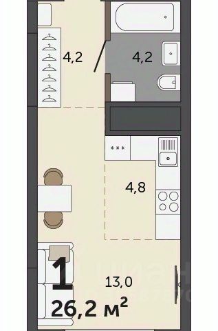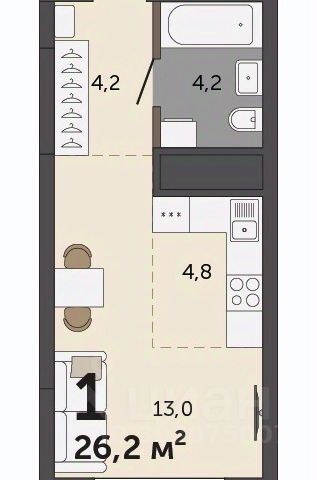 Общая площадь - 24м2, жилая - 11,4м2, кухонная зона - 3,8м2, прихожая - 4,3м2.