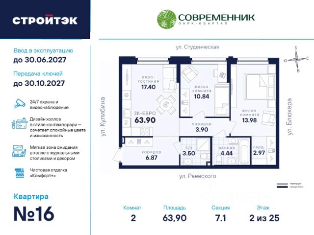 Время жить счастливо Современник — знаковый парк-квартал в интеллигентном районе Втузгородок, откуда недалеко до центра, а вблизи ведущие вузы и театры. Квартал состоит из 8 очередей строительства. Шесть очередей уже сданы и заселены; седьмая строится. В продаже квартиры от застройщика: 1 этап строящейся 7-й очереди. Объединяет квартал большой внутренний парк площадью в гектар — богатый прогулочными маршрутами, тенистыми деревьями, пространствами для отдыха, спорта и детских игр. С внешней стороны, у домов седьмой очереди, появится гостевой центр. Проект создавали в KCAP Architects and Planners, архитектурном бюро из Нидерландов, чьи работы украшают ландшафты Гамбурга, Роттердама, Антверпена и других городов Европы. Современные технологии, продуманное пространство и трендовый облик зданий создают размеренную и счастливую атмосферу для жизни здесь. Достойное окружение До проспекта Ленина на машине вы доберётесь за 10 минут, а с другой стороны, неподалёку — Шарташский лесопарк с озером Шарташ, которому около миллиона лет. Здесь для вас пляжи, лодочные станции, тропы для бега, спортивные площадки и кафе. В квартале уже работают супермаркеты, пекарни, салон красоты и не только. Ближние школы, гимназии и университеты помогут расправить крылья новым поколениям, а детские сады станут заботливой средой в начале пути. Кстати, на территории квартала спроектирован муниципальный детский сад на 200 мест. Выходите во двор Гуляйте по зелёным аллеям или устройтесь с книгой в гамаке. Займитесь воркаутом, футболом, баскетболом или пинг-понгом. Проводите семейные праздники под крытым амфитеатром или отправьте детей весело играть на насыщенный плейхаб. Мы всё предусмотрели. На закрытой территории без машин и посторонних спокойно и безопасно. Видеонаблюдение и освещение добавляют ещё больше уверенности. Впечатляющая доминанта у домов 7 очереди — новый гостевой центр: камерное пространство под навесом-перголой с озеленением и скамейками, чтобы встречать друзей или просто коротать вечер. Ваша зона комфорта Стильное лобби Современника мы выполним в эстетике contemporary: минимализм, сочетание дерева со штукатуркой и тёмным металлом, зеркала, витражи. Обстановка из мягкой мебели, растений и книг. Двери из холла выходят на обе стороны. Внутри — специальная комната для колясок и самокатов. На минус первом этаже подземный паркинг с 201 машино-местом, куда легко попасть на лифте прямо с вашего этажа. Здесь же можно приобрести одну из 67 кладовых, чтобы хранить сезонный инвентарь и крупную технику. СТРОЙТЭК возводит 7 очередь в 3 этапа. Дом с привилегиями Первый этап — секция 7.1, отдельная башня в 25 этажей. Здесь 246 квартир в 19 уникальных планировках от студий до 3-комнатных, в классических и евро-вариантах. Просторные кухни-гостиные, гардеробные и окна на 2 стороны — лишь часть их плюсов. В Современнике улучшенный стандарт отделки "Комфорт +". Помимо привычных комфортных сантехники и электрики, в него входят оконные стёкла Energy Light, которые помогают сохранять комфорт Квартира в ЖК Современник в Екатеринбурге.
