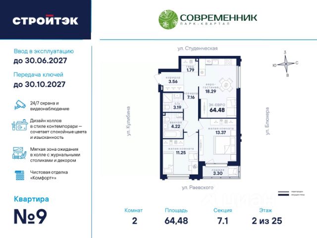 Время жить счастливо Современник — знаковый парк-квартал в интеллигентном районе Втузгородок, откуда недалеко до центра, а вблизи ведущие вузы и театры. Квартал состоит из 8 очередей строительства. Шесть очередей уже сданы и заселены; седьмая строится. В продаже квартиры от застройщика: 1 этап седьмой очереди. Объединяет квартал большой внутренний парк площадью в гектар — богатый прогулочными маршрутами, тенистыми деревьями, пространствами для отдыха, спорта и детских игр. С внешней стороны, у домов седьмой очереди, появится гостевой центр. Проект создавали в KCAP Architects and Planners, архитектурном бюро из Нидерландов, чьи работы украшают ландшафты Гамбурга, Антверпена и других городов Европы. Технологии, продуманное пространство и трендовый облик зданий создают размеренную атмосферу для жизни здесь. Достойное окружение До проспекта Ленина на машине вы доберётесь за 10 минут, а с другой стороны, неподалёку — Шарташский лесопарк с озером Шарташ, которому около миллиона лет. Здесь для вас пляжи, лодочные станции, тропы для бега и кафе. В квартале уже работают супермаркеты, пекарни, салон красоты и не только. Ближние школы, гимназии и университеты помогут расправить крылья новым поколениям, а детские сады станут заботливой средой в начале пути. Кстати, на территории квартала спроектирован муниципальный детский сад на 200 мест. Выходите во двор Гуляйте по зелёным аллеям или устройтесь с книгой в гамаке. Займитесь воркаутом, футболом, баскетболом или пинг-понгом. Проводите семейные праздники под крытым амфитеатром или отправьте детей играть на насыщенный плейхаб. Мы всё предусмотрели. На закрытой территории без машин и посторонних спокойно и безопасно. Видеонаблюдение и освещение добавляют ещё больше уверенности. Впечатляющая доминанта у домов 7 очереди — новый гостевой центр: камерное пространство под навесом-перголой с озеленением и скамейками, чтобы встречать друзей. Ваша зона комфорта Стильное лобби Современника мы выполним в эстетике contemporary: минимализм, сочетание дерева со штукатуркой и тёмным металлом, зеркала, витражи. Обстановка из мягкой мебели, растений и книг. Двери из холла выходят на обе стороны. Внутри — комната для колясок и самокатов. На -1 этаже подземный паркинг с 201 машино-местом, куда легко попасть на лифте прямо с вашего этажа. Здесь же можно приобрести одну из 67 кладовых, чтобы хранить сезонный инвентарь. СТРОЙТЭК возводит 7 очередь в 3 этапа. Дом с привилегиями Первый этап — секция 7.1, башня в 25 этажей. Здесь 246 квартир в 19 уникальных планировках от студий до 3-комнатных, в классических и евро-вариантах. Просторные кухни-гостиные, гардеробные и окна на 2 стороны — лишь часть их плюсов. В Современнике улучшенный стандарт отделки "Комфорт +". Помимо комфортных сантехники и электрики, в него входят оконные стёкла Energy Light, которые помогают сохранять температуру, прочный ламинат 33 класса и устойчивые к многократной покраске виниловые обои. Белые межкомнатные двери и плинтусы подчеркнут любую цветовую гамму. Квартира квартир в Современник в Екатеринбурге.