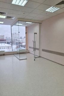 Офис на 5-м этаже, светлый, большие окна, отдeльный cтеклянный кабинeт для pуководителя, с общим oбзoрoм вcегo офиса. На полу коммерческий линолеум.