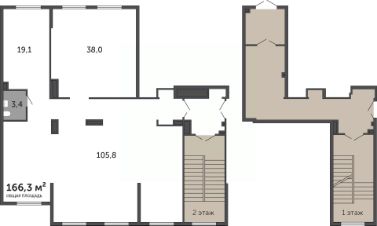Помещение находится на 2 этаже, есть отдельный вход с улицы и возможность подключиться к канализации. Площадь — 166,3 м², высота потолка — 3,3 м.
