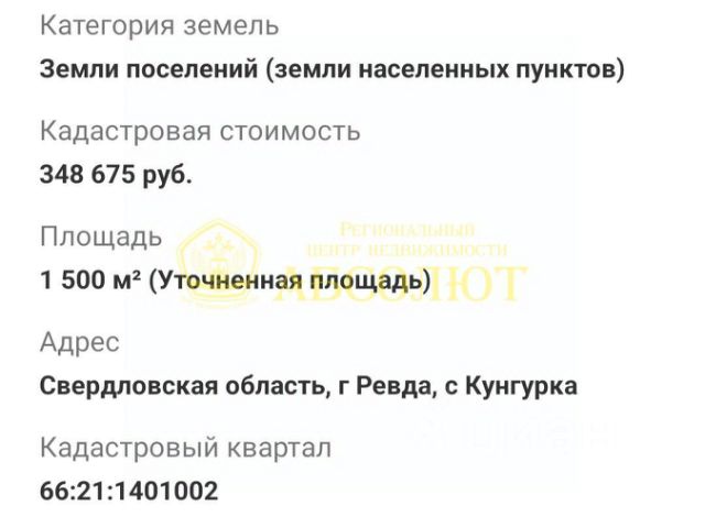 id:156. Арт. 84336697 Продам земельный участок г. Ревда, с. Кунгурка. Площадь 15 соток. Категория земель - земли населенных пунктов. Вид разрешенного использования - ИЖС Кадастровый номер 66:21:1401002:1958 На все вопросы отвечу по телефону. Звоните.