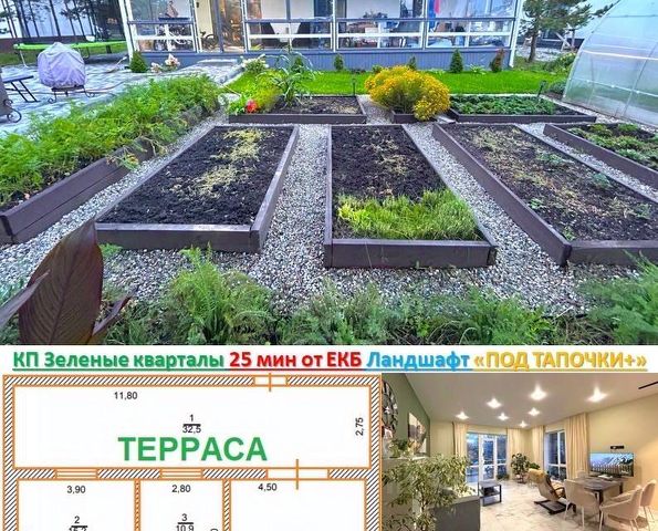 НОВЫЙ обжитой благоустроенный, 1-но этажный коттедж в пригороде Екатеринбурга. Проект Уютное гнездышко, коттедж, на ровном участке в окружении зеленых сосенок. Капитальные и межкомнатные стены из твин блоков, все перекрытие пола железобетонное. В доме 8 помещений: 4 жилых комнаты до 28 кв.м., гостиная с кухонной зоной, санузел, тамбур с прихожей и коридором. Санузел оборудован техникой, бойлер, раковина, унитаз, есть разводка под стиральную машину, ванную и душевую кабинку. Скважина 60 метров, настоящий Биосептик-дренаж (не требующий постоянного выкачивания), горячая и холодная вода подключены к коммуникациям дома. Отделка (понятно) как под ключ, использованы современные качественные материалы: натяжные потолки, керамогранит (весь пол), обои, пластиковые окна увеличенного размера, на входе стальная сейф-дверь. Во всём доме, весь этаж теплые полы. Отопление водяное от электрокотла, в посёлке есть газ. Часть окон расположено на юг, восток и запад - поэтому в доме светло и солнечно, с раннего утра до позднего вечера. Удачное расположение спален, в двух спальнях можно наблюдать красивый восход солнца и в одной сказочный закат. Выход на террасу 32 кв.м. с крышей и мягкими окнами осуществляется из кухни-гостиной и далее к зоне отдыха с барбекю и бане Удобное расположение дома в посёлке, он находится не далеко от въезда. Звоните договоримся на просмотр. Дом и земельный участок собственности. Один совершеннолетний собственник. Обременении долги отсутствуют. Документы к сделке готовы. Оперативный показ.