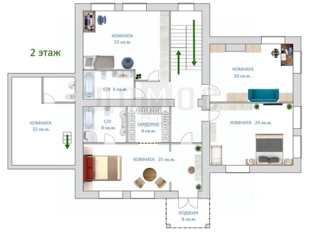Второй этаж: две мастер спальни с ванными комнатами в каждой, оборудованными по последнему слову техники. Большая гардеробная.