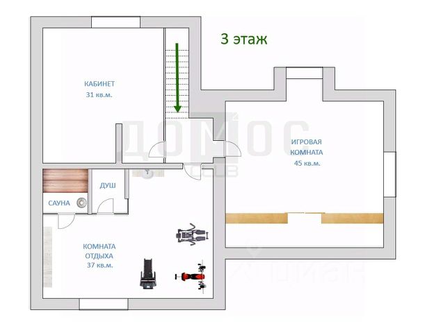 Мансардный этаж: три спальных комнаты, ванная комната с душем и джакузи.