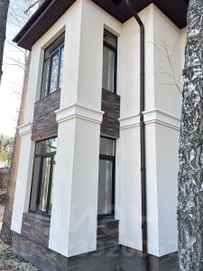 Фасад: комбинированный, декоративная штукатурка, термообработанная древесина, планкен.