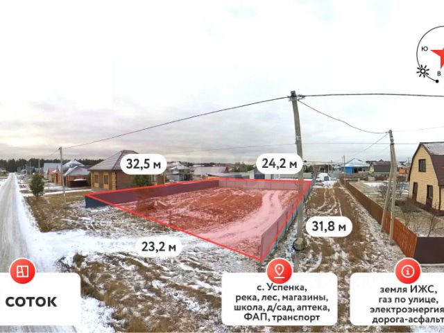 Отличный земельный участок в коттеджном поселке с красивым названием " Московские усадьбы". Всего 15 минут до Тюмени, и 3 минуты до с. Успенка, где расположен детский сад, школа и прочая необходимая инфраструктура. В самом коттеджном поселке, своя управляющая компания, газ, электричество 10-15 кВт и КПП. Соседи уже строятся, у некоторых уже стоят готовые дома и проживают в них."Московские усадьбы" - это коттеджный поселок, где уже все готово. А именно отсыпаны дороги, подведены электричество и газ к каждому участку. Уже сегодня вы можете не только начать строить собственный дом, но и жить в нем. Поселок расположен на 23 километре Московского тракта. Дорога до поселка это быстрая и безопасная четырех полосная трасса с металлическим ограждением на всей протяженности и с ограничением скорости до 90 километров в час. Коттеджный поселок расположен на земельном участке площадью 41 га, недалеко от деревни Елань. С востока от участка небольшая речушка Ушаковка, на северо-востоке расположен небольшой лес, отделяющий территорию от Елани. Для купания можно доехать до Ушаковского озера или Переваловских карьеров, а для всех любителей рыбалки достаточно близко Пышма излюбленное место для всех окрестных рыбаков. Коттеджный поселок находится на удалении 2 километров от села Успенка и 5 километров от села Перевалово. Близость к центрам муниципальных образований "Переваловское" и "Успенское" обеспечивает доступ к детским садам, школам, медпунктам, продовольственным магазинам и отделениям Сбербанка, а также к библиотекам, домам культуры, аптекам и почте. Помимо этого, на территории самого поселка предусмотрены участки для размещения магазинов для продуктов и товаров первой необходимости, кафе, а также детского сада или детского досугового центра.