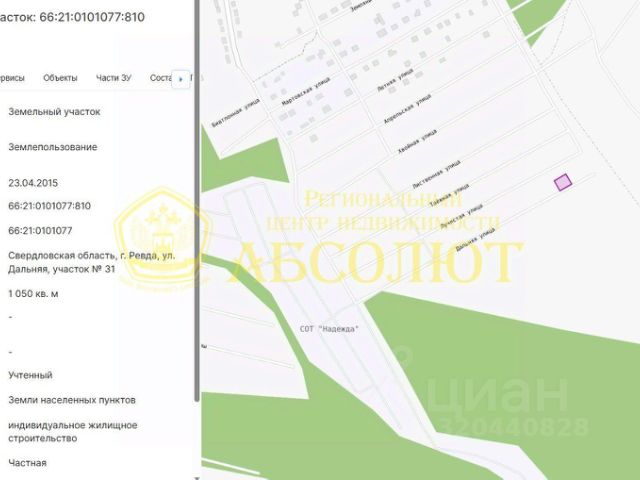 id:667. Арт. 35281594 ПРОДАМ ЗЕМЕЛЬНЫЙ УЧАСТОК ПОД СТРОИТЕЛЬСТВО ДОМА ВАШЕЙ МЕЧТЫ Продается замечательный земельный участок в самом экологически чистом районе города Ревды. Участок в окружении соснового бора, даже есть на участке несколько красивых сосен. Участок ровный, сухой. Отмежеван. Границы участка определены. Очень красивый вид. Электричество и газ совсем рядом, газифицированный дом в 30 метрах. Отличный подъезд к участку по хорошей дороге позволит сразу начать строительство ДОМА МЕЧТЫ. Из Вашего нового ДОМА откроется великолепный вид на природу и поселок. Отличное место, вся инфраструктура рядом: магазины, остановки общественного транспорта, удобный подъезд с Металлистов и Мамина-Сибиряка. Удобный выезд на трассу (Ново-Московский тракт) до городов Екатеринбург, Первоуральск, Дегтярск и др. Экологически-чистое место, на участке естественный ландшафт- ЛЕСНОЙ МАССИВ. (Лес-сосняк стоит ТЫСЯЧ на сто на корню).Можно жить В СВОЕМ ЛЕСУ . Ягоды-грибы. Категория земель: земли населенных пунктов; Разрешенное использование: индивидуальное жилищное строительство; Кадастровый номер 66:21:0101077:1451. ПРОДАЖА ОТ СОБСТВЕННИКА. Показ в любое время. Звоните, с удовольствием расскажу и покажу.