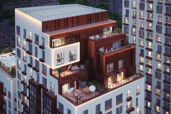 Квартал состоит из домов переменной этажности и сочетает в себе приватность и динамику активного города. По периметру его формируют невысокие дома с террасами на последних этажах и три башни, которые выполняют функцию визуального ориентира — по выразительному силуэту узнать квартал можно издалека. Внутри квартала мы расположили шесть урбан-вилл — это новый для города формат невысоких домов с одним подъездом на 20-30 семей. Такие дома расположены вдали от шумных улиц и окружены зеленью.