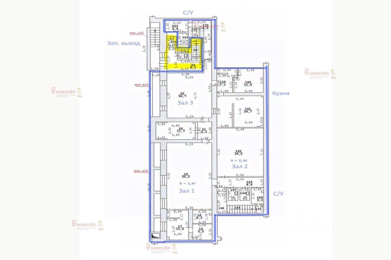 Общая площадь 250кв.м. разделена на 3 зала, две зоны санузлов, кухню и несколько подсобных помещений.