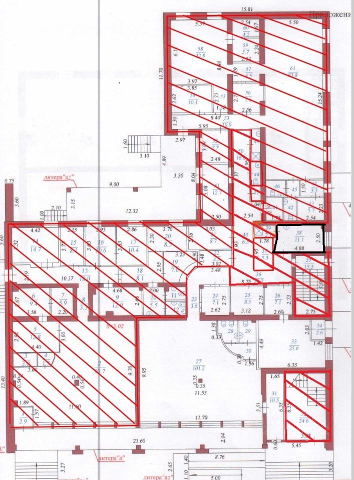 1) здание, 1-й этаж,помещение 38, площадью 11,1 кв.м.