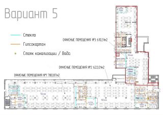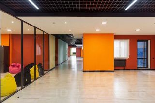 - открытая планировка, рассчитанная на 100 рабочих мест, в том числе: 2 переговорных, 2 кабинета, оборудованная кухня, 4 отдельных туалета с шумоизоляцией, серверная, раздевалка, 4 комнаты свободного назначения, балкон;