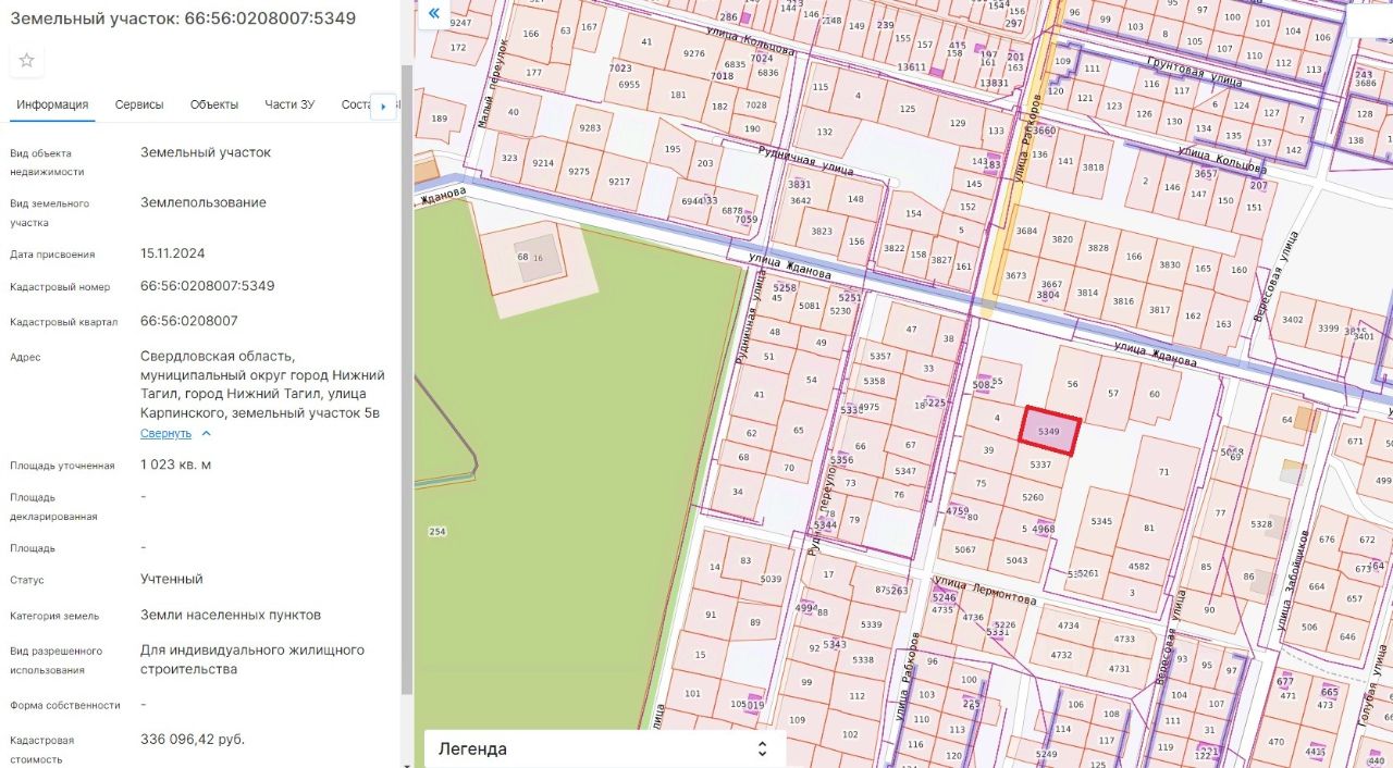 Лот 2. Земельный участок для индивидуального жилищного строительства. Категория земель земли населенных пунктов. Кадастровый номер 66:56:0208007:5349. Местоположение: Свердловская область, муниципальный округ город Нижний Тагил, город Нижний Тагил, улица Карпинского, земельный участок 5в. Площадь земельного участка 1023 кв. метра. Разрешенное использование земельного участка для индивидуального жилищного строительства. Срок аренды земельного участка 20 лет. Начальная цена (ежегодный размер арендной платы) 67 200 (шестьдесят семь тысяч двести) рублей. "Шаг аукциона" 3 300 (три тысячи триста) рублей. Размер задатка 13 400 (тринадцать тысяч четыреста) рублей