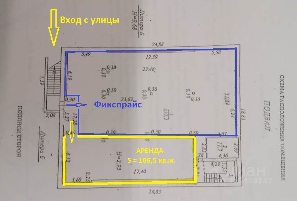Площадь помещения 106,5 кв.м., планировка имеет правильную прямоугольную форму (размеры помещения 6,12 Х 17,4 м.).