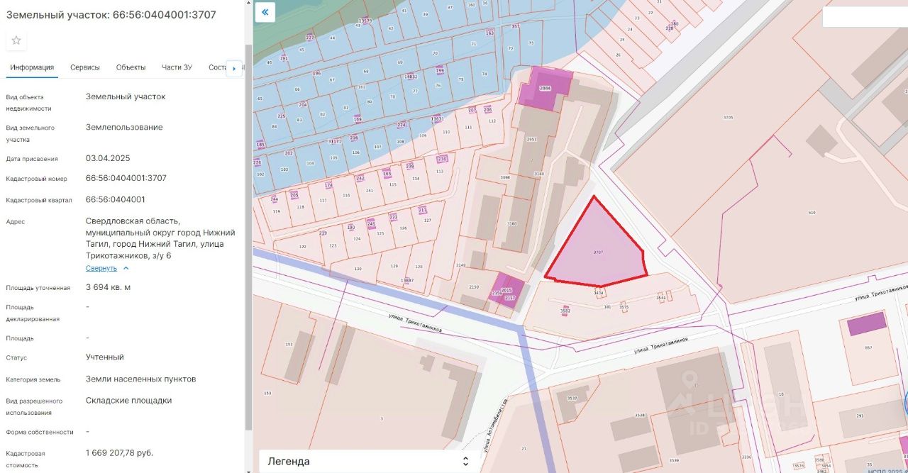 Лот 2. Земельный участок для размещения складских площадок. Категория земель земли населенных пунктов. Кадастровый номер 66:56:0404001:3707. Местоположение: Свердловская область, муниципальный округ город Нижний Тагил, город Нижний Тагил, улица Трикотажников, з/у 6. Площадь земельного участка 3694 кв. метра. Разрешенное использование земельного участка складские площадки. Срок аренды земельного участка 49 лет. Начальная цена (ежегодный размер арендной платы) 193 150 (сто девяносто три тысячи сто пятьдесят) рублей. "Шаг аукциона" 9 600 (девять тысяч шестьсот) рублей. Размер задатка 38 600 (тридцать восемь тысяч шестьсот) рублей