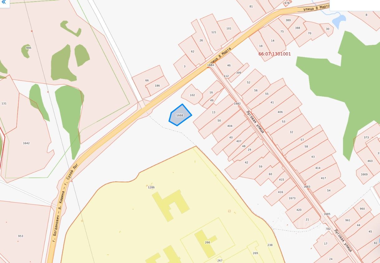 Земельный участок с кадастровым номером 66:07:1301001:1668, площадь 1600, по адресу Российская Федерация, Свердловская область, городской округ Богданович, село Коменки, улица 8 Марта, земельный участок 56