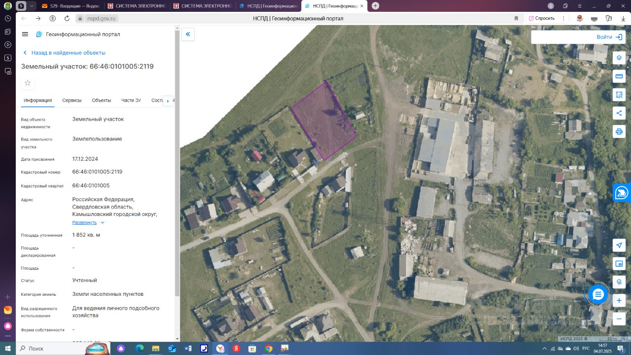 Земельный участок с кадастровым номером 66:46:0101005:2119. Адрес земельного участка: Российская Федерация, Свердловская область, Камышловский городской округ, город Камышлов, улица Степная, земельный участок 41а , Площадь земельного участка: 1852,00 кв. м.