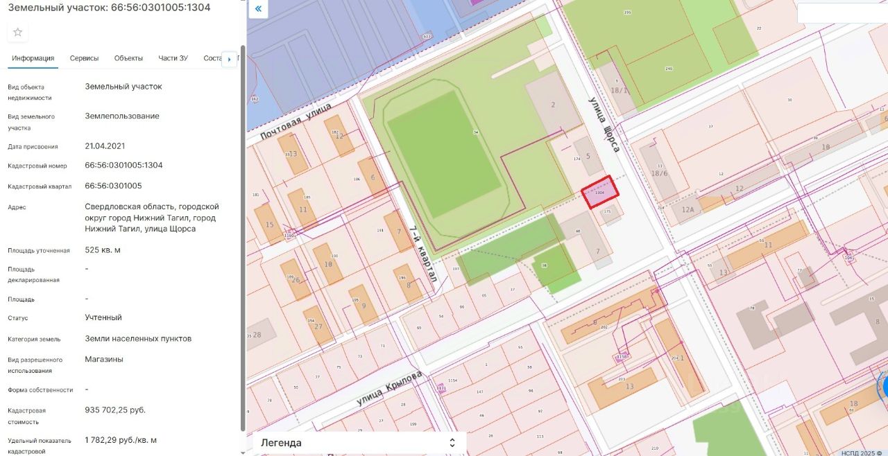 Лот 1. Земельный участок для строительства. Категория земель земли населенных пунктов. Кадастровый номер 66:56:0301005:1304. Местоположение: Свердловская область, городской округ город Нижний Тагил, город Нижний Тагил, улица Щорса. Площадь земельного участка 525 кв. метров. Разрешенное использование земельного участка магазины. Срок аренды земельного участка 4 года 10 месяцев. Начальная цена (ежегодный размер арендной платы) 219 000 (двести девятнадцать тысяч) рублей. "Шаг аукциона" 10 900 (десять тысяч девятьсот) рублей. Размер задатка 43 800 (сорок три тысячи восемьсот) рублей