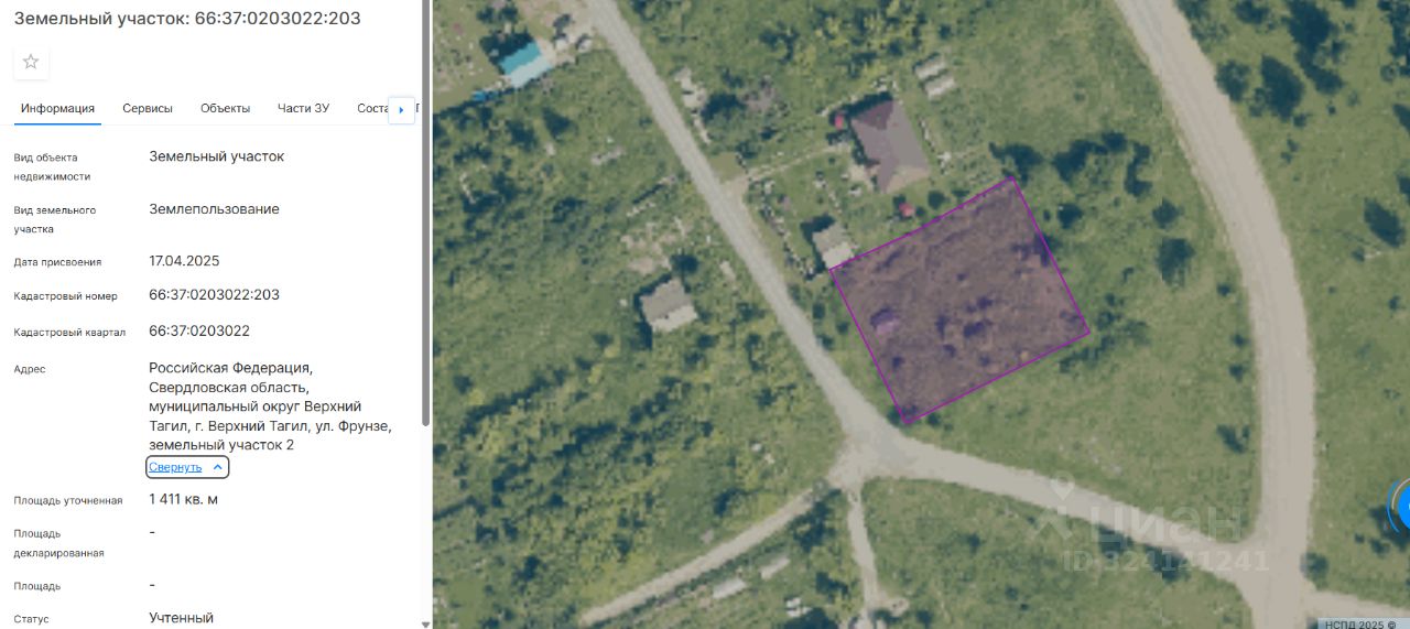 Земельный участок с кадастровым номером 66:37:0203022:203, общей площадью 1411,00 кв.м., категория земель земли населенных пунктов, с разрешенным использованием для индивидуального жилищного строительства, расположенный по адресу: Российская Федерация, Свердловская область, муниципальный округ Верхний Тагил, г. Верхний Тагил, ул. Фрунзе, земельный участок 2