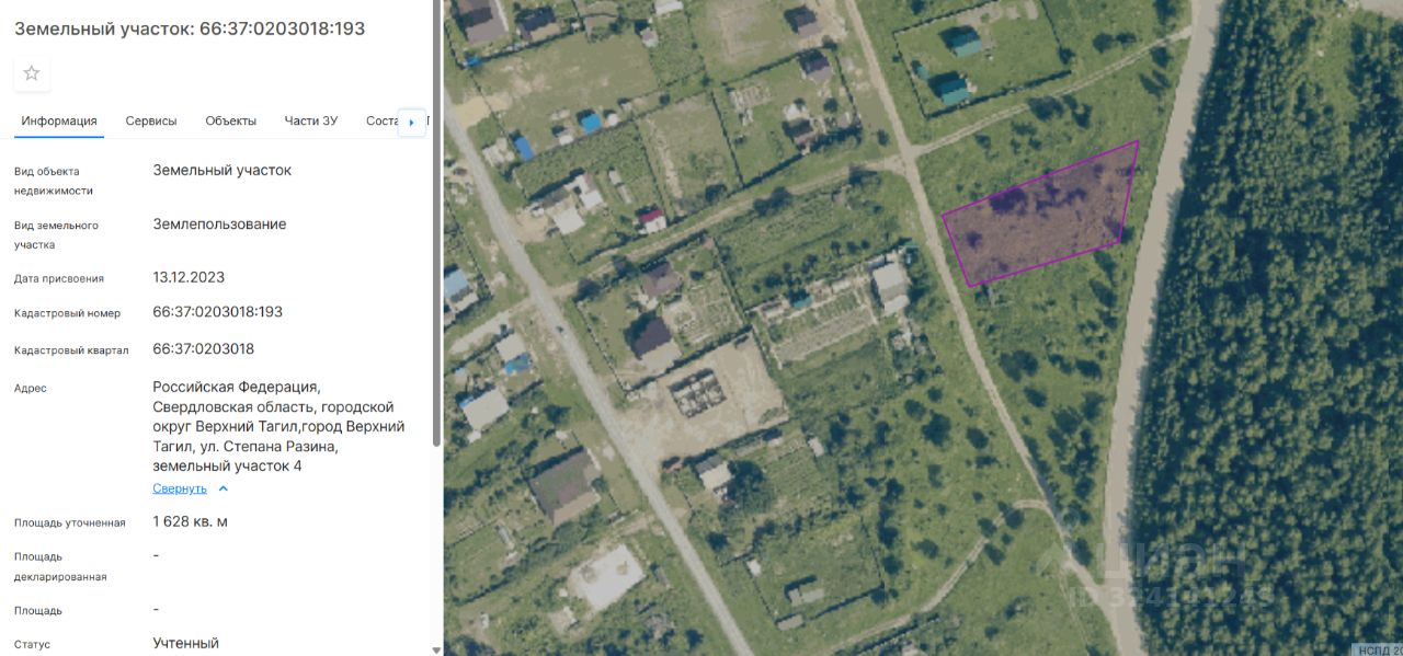 Земельный участок с кадастровым номером 66:37:0203018:193, общей площадью 1628,00 кв.м., категория земель земли населенных пунктов, с разрешенным использованием для индивидуального жилищного строительства, расположенный по адресу: Российская Федерация, Свердловская область, городской округ Верхний Тагил, город Верхний Тагил, ул. Степана Разина, земельный участок 4