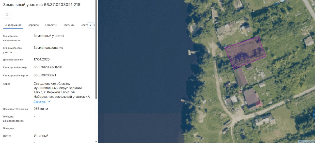 Земельный участок с кадастровым номером 66:37:0203021:218, общей площадью 965,00 кв.м., категория земель земли населенных пунктов, с разрешенным использованием для индивидуального жилищного строительства, расположенный по адресу: Свердловская область, муниципальный округ Верхний Тагил, г. Верхний Тагил, ул. Набережная, земельный участок 4А
