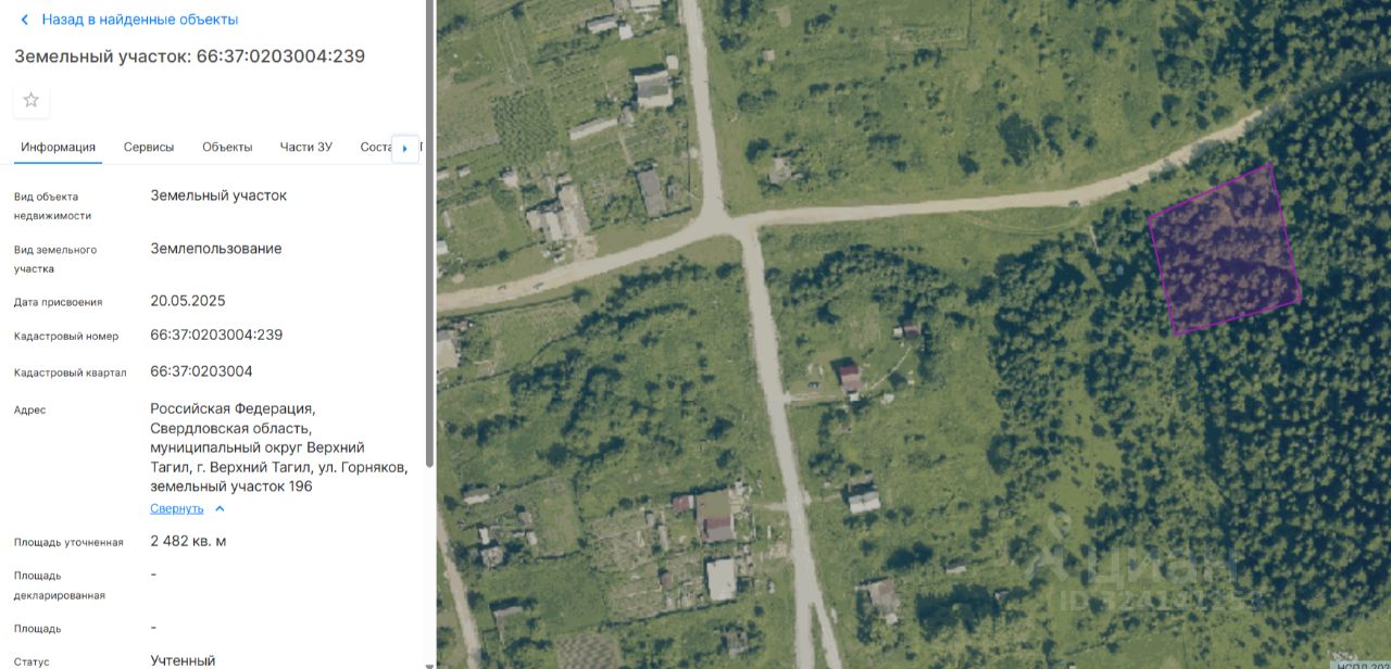 Земельный участок с кадастровым номером 66:37:0203004:239, общей площадью 2482,00 кв.м., категория земель земли населенных пунктов, с разрешенным использованием для индивидуального жилищного строительства, расположенный по адресу: Российская Федерация, Свердловская область, муниципальный округ Верхний Тагил, г. Верхний Тагил, ул. Горняков, земельный участок 196