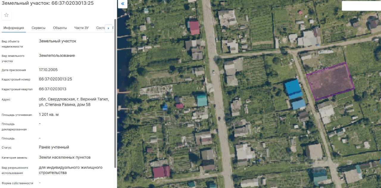 Земельный участок с кадастровым номером 66:37:0203013:25, общей площадью 1201,00 кв.м., категория земель земли населенных пунктов, с разрешенным использованием для индивидуального жилищного строительства, расположенный по адресу: обл. Свердловская, г. Верхний Тагил, ул. Степана Разина, дом 58