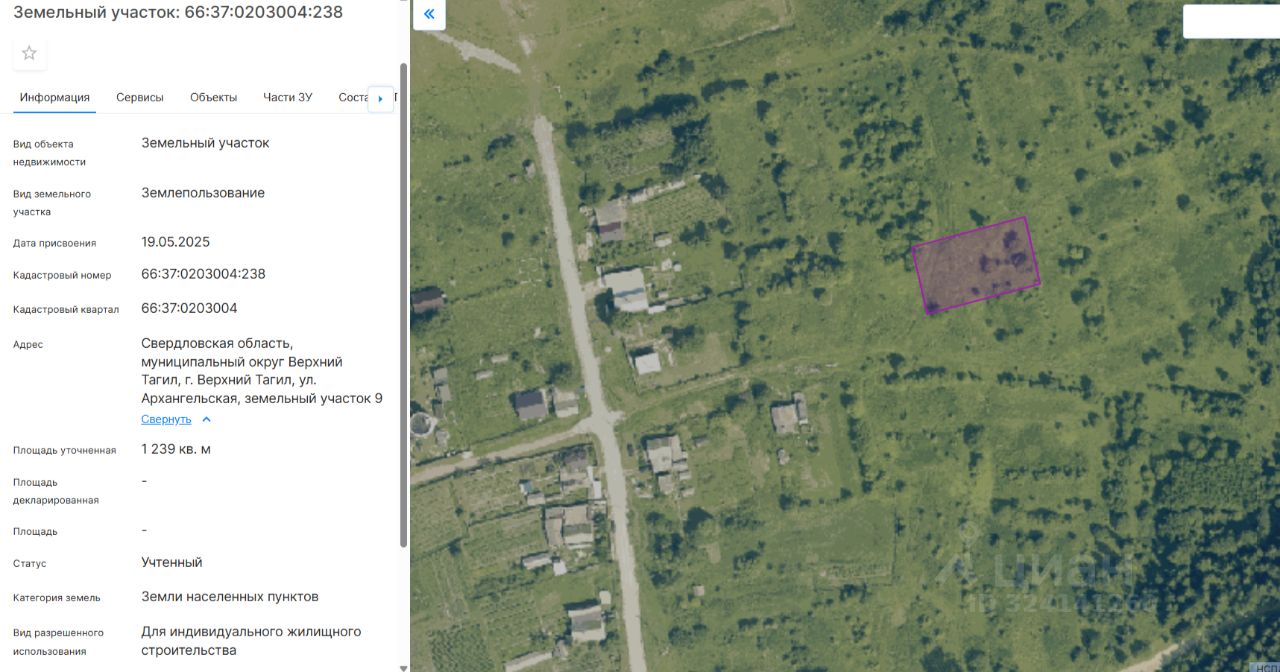 Земельный участок с кадастровым номером 66:37:0203004:238, общей площадью 1239,00 кв.м., категория земель земли населенных пунктов, с разрешенным использованием для индивидуального жилищного строительства, расположенный по адресу: Свердловская область, г. Верхний Тагил, ул. Архангельская, земельный участок 9