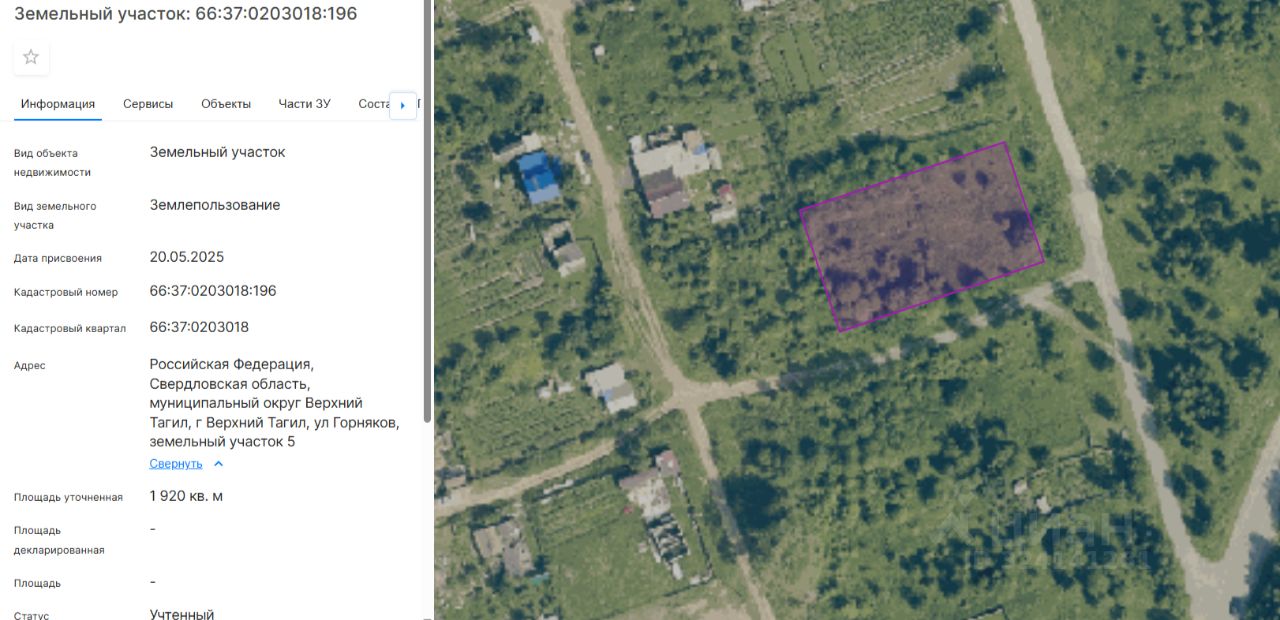 Земельный участок с кадастровым номером 66:37:0203018:196, общей площадью 1920,00 кв.м., категория земель земли населенных пунктов, с разрешенным использованием для индивидуального жилищного строительства, расположенный по адресу: Российская Федерация, Свердловская область, муниципальный округ Верхний Тагил, г. Верхний Тагил, ул. Горняков, земельный участок 5
