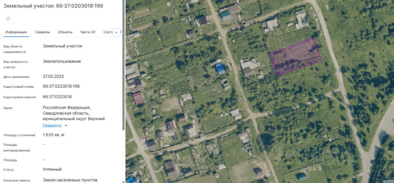 Земельный участок с кадастровым номером 66:37:0203018:198, общей площадью 1635,00 кв.м., категория земель земли населенных пунктов, с разрешенным использованием для индивидуального жилищного строительства, расположенный по адресу: Российская Федерация, Свердловская область, муниципальный округ Верхний Тагил, г. Верхний Тагил, ул. Горняков, земельный участок 7