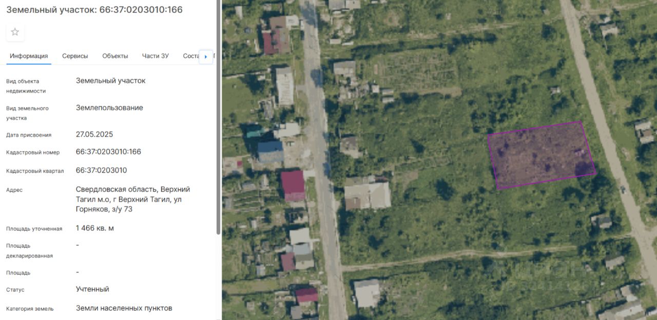 Земельный участок с кадастровым номером 66:37:0203010:166, общей площадью 1466,00 кв.м., категория земель земли населенных пунктов, с разрешенным использованием для индивидуального жилищного строительства, расположенный по адресу: Свердловская область, Верхний Тагил м.о., г. Верхний Тагил, ул. Горняков, з/у 73
