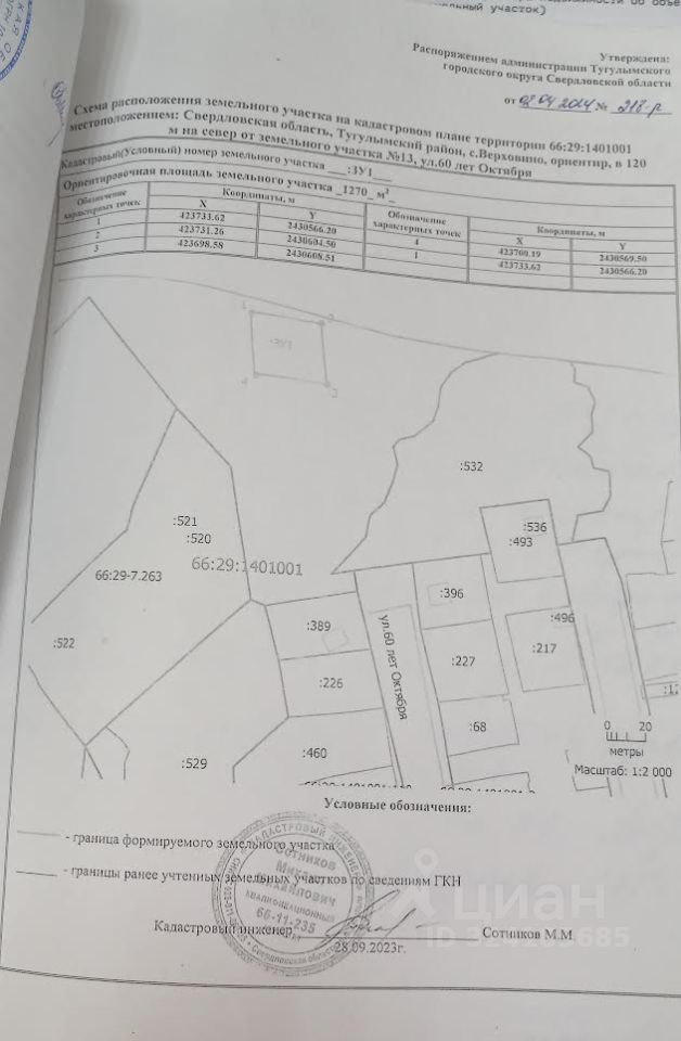 Земельный участок, кадастровый номер 66:29:1401001:715, площадью 1270,0 кв. м., расположенный по адресу: РФ, Свердловская область, Тугулымский городской округ, с. Верховино, ул. 60 лет Октября, д. 21, категория земель: земли населенных пунктов; вид разрешенного использования: для ведения личного подсобного хозяйства (приусадебный земельный участок).