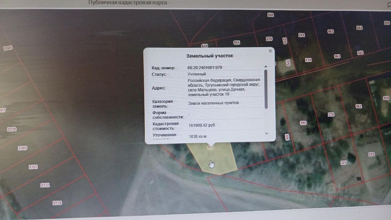 Земельный участок, кадастровый номер 66:29:2401001:979, площадью 1838 кв. м., расположенный по адресу: РФ, Свердловская область, Тугулымский район, с. Мальцево, ул. Дачная, 19, категория земель: земли населенных пунктов; вид разрешенного использования: для индивидуального жилищного строительства.