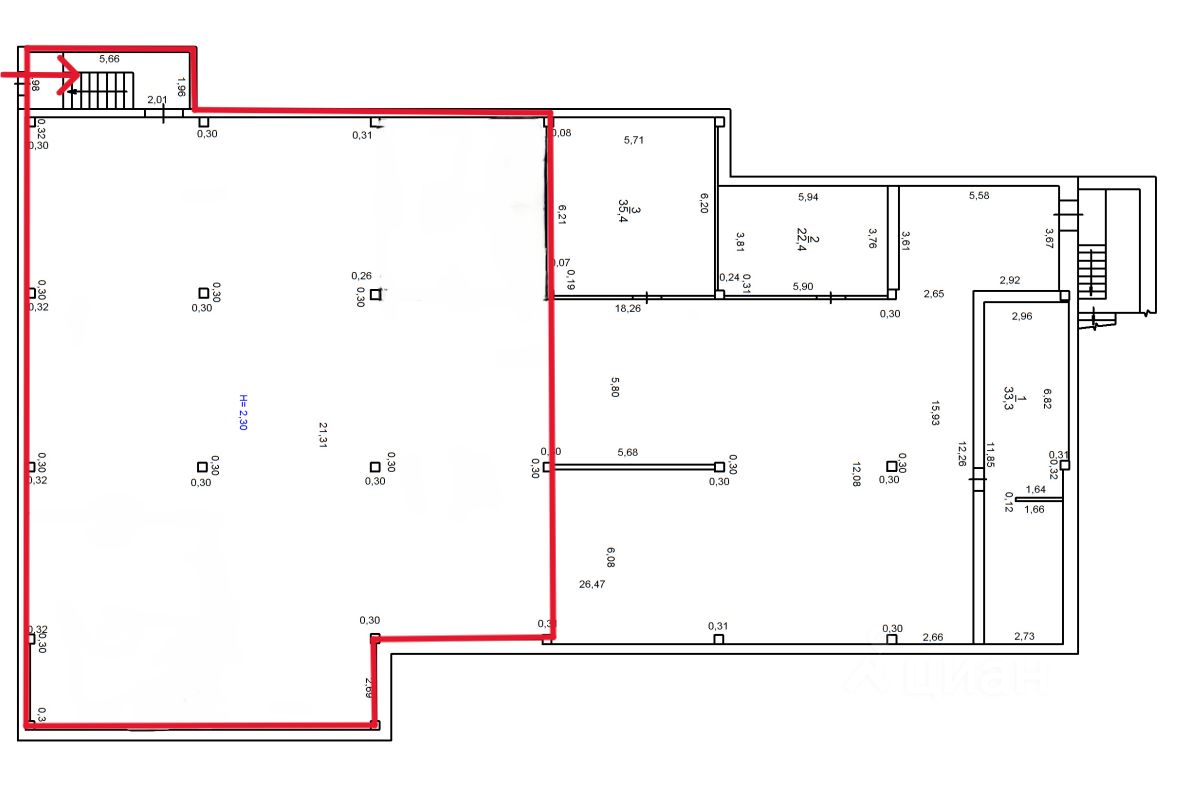 - Высота потолков - 2,30 м.