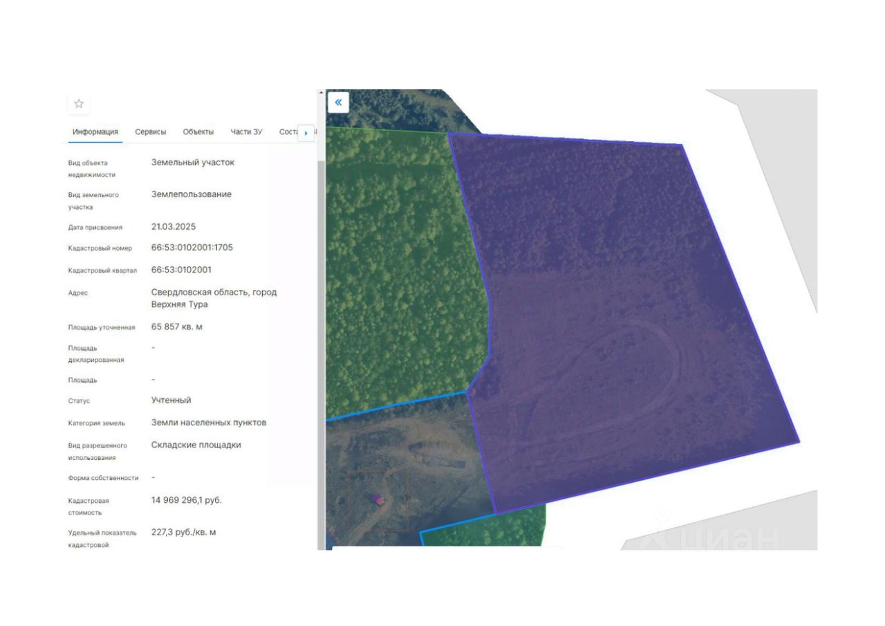 Земельный участок с кадастровым номером 66:53:0102001:1705, категория земель - земли населенных пунктов, общей площадью: 65 857,0,0 кв. м., вид разрешенного использования: складские площадки, адрес объекта: Свердловская область, г. Верхняя Тура